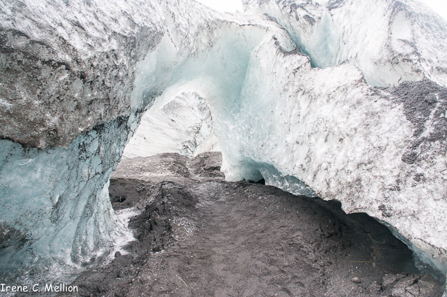 The black cones seen on the ice are formed in an interesting way. Ash covered the glacier and was washed into cracks where it accumulated in depth.